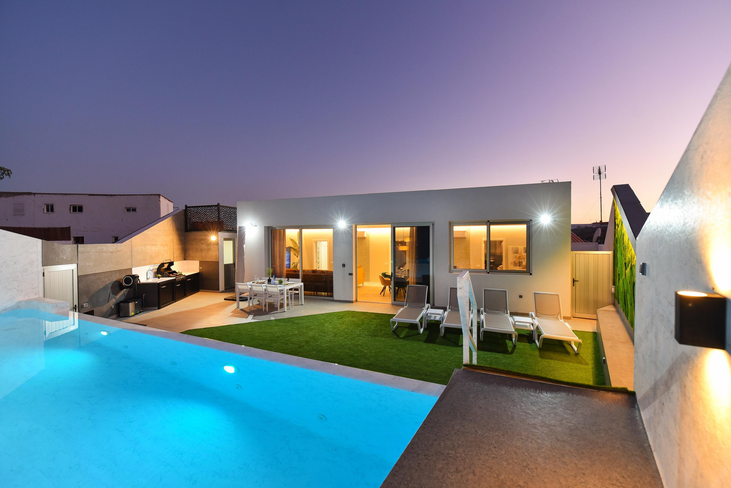 This modern villa in the sunny south of Gran Canaria is located in a quiet residential area. Villa Moderno has a lovely private heated pool with massage chairs for complete relaxation. In the outside area there are several nice spots to enjoy the sun. There is a generous barbecue area and a lovely lounge terrace where you can see the sea in the distance. The villa is modern and stylishly decorated. The beautiful sandy beaches of Maspalomas are just a 15-minute drive away.