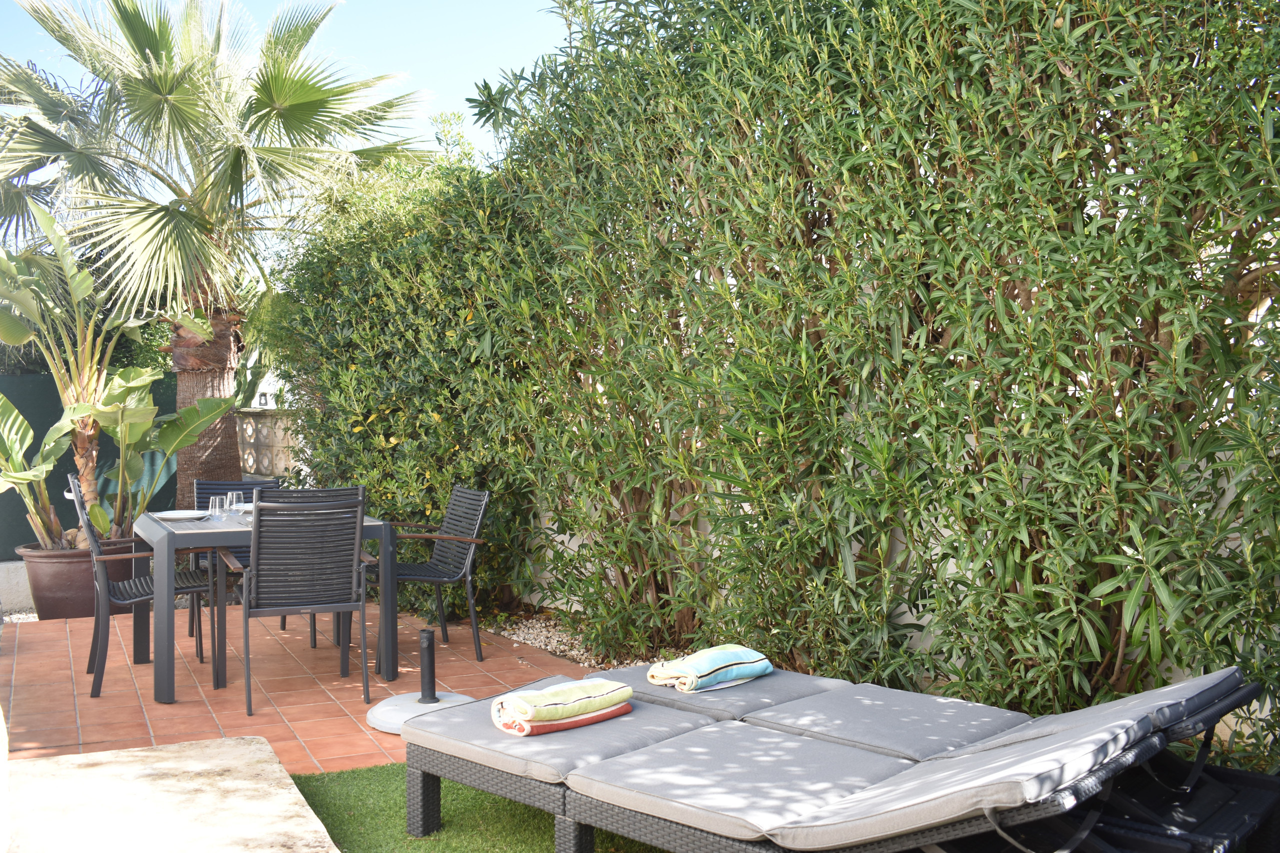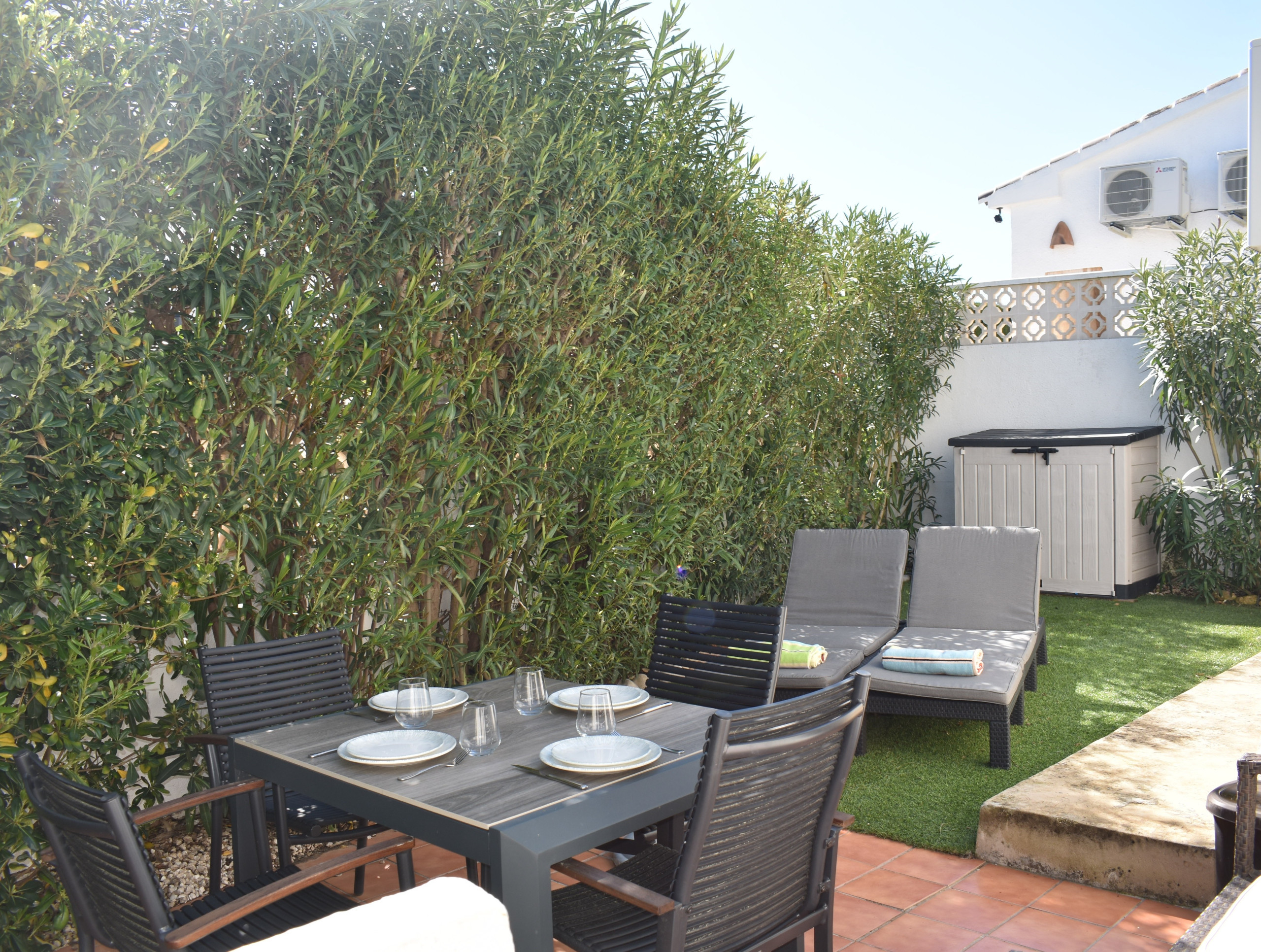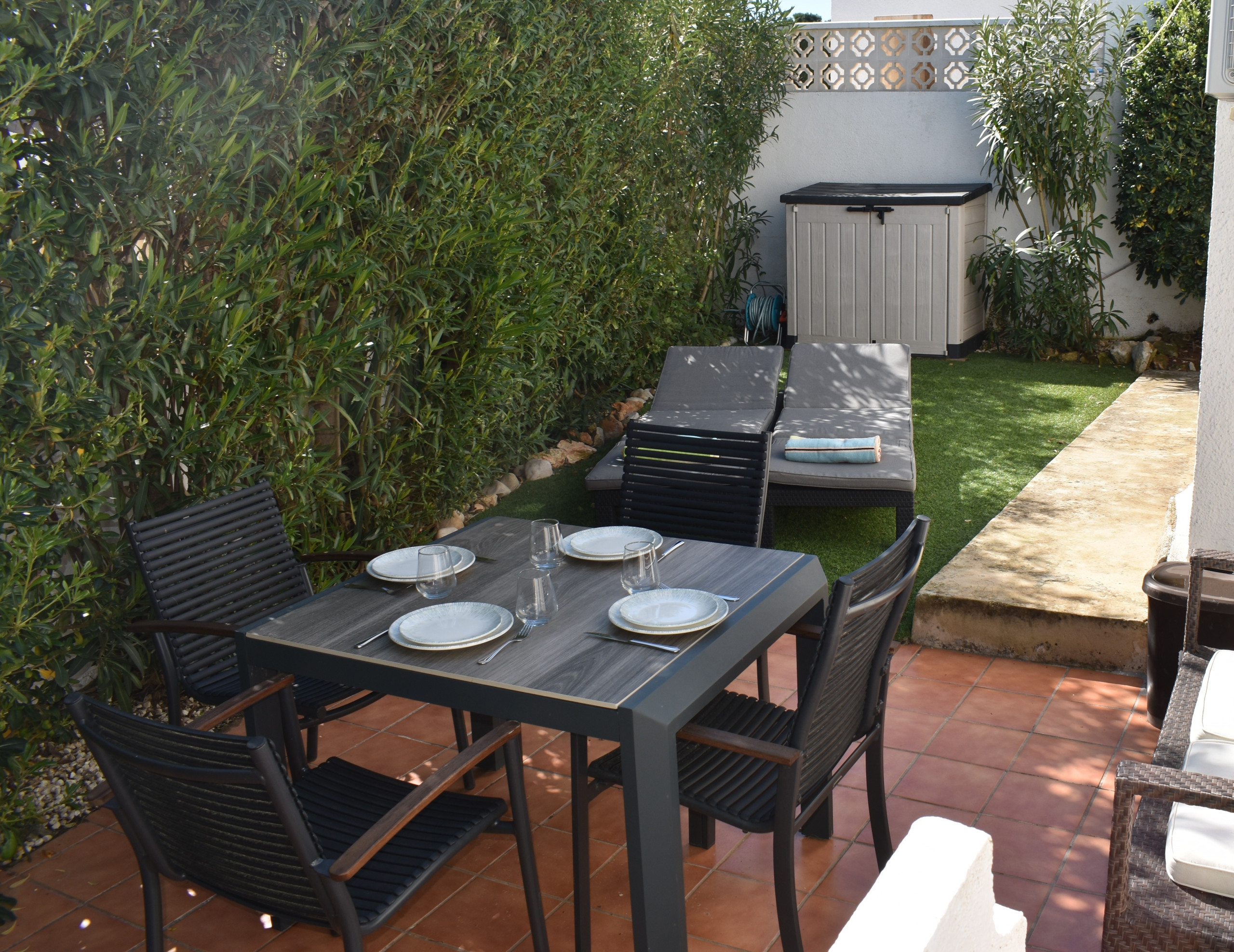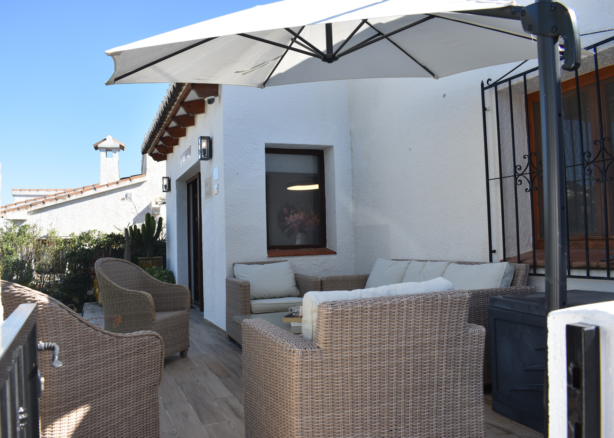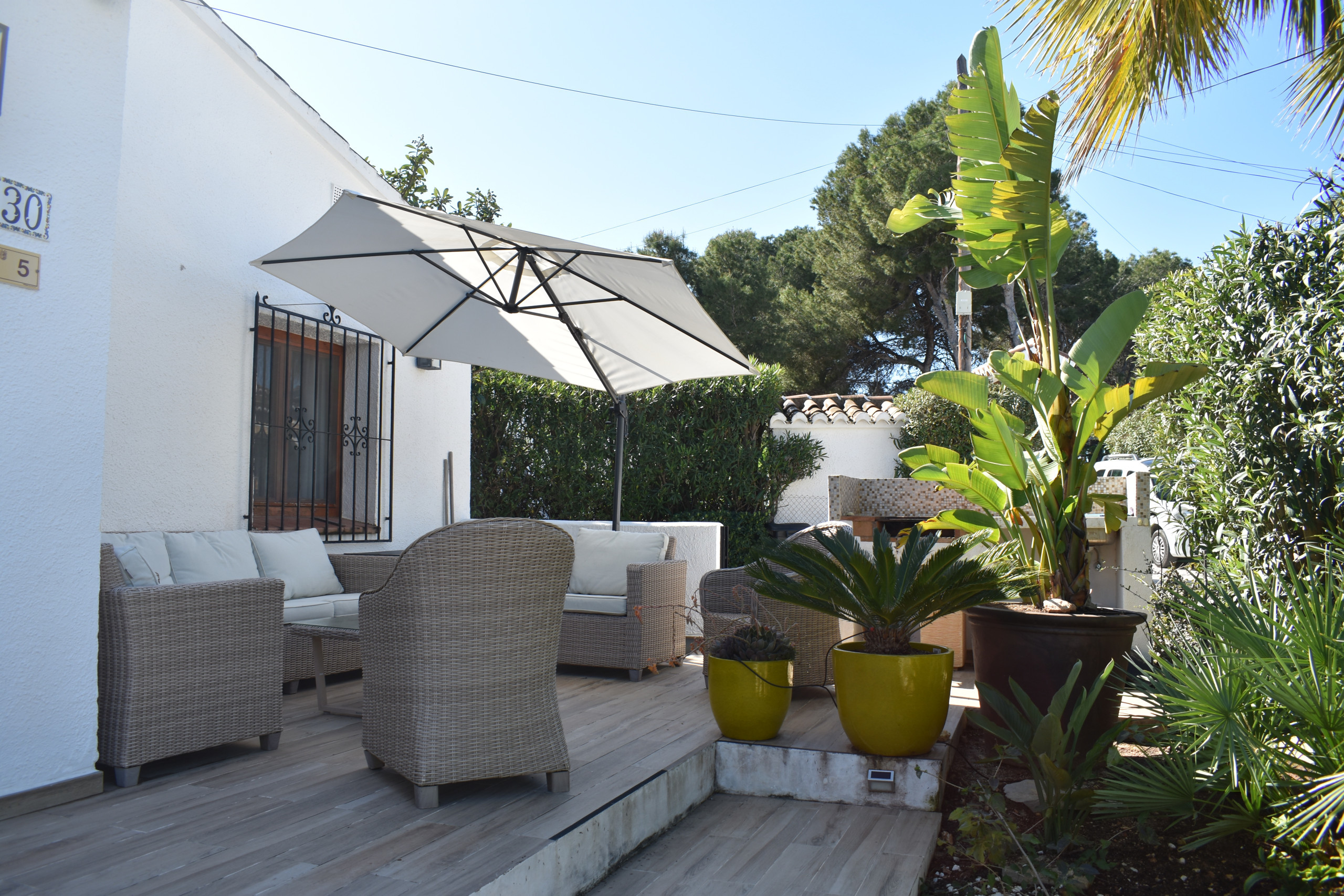 It is wonderful to spend time outdoors at Casa Girasol. Because a lovely spot has been created at both the front and back of the house, there is always the option to stay in the shade in the sun. Lounge set, 2 sun loungers, parasol, and a 4-person outdoor dining table are available. The charcoal barbecue completes the picture, allowing you to enjoy the long, sultry Spanish summer evenings together. Next to his house is a private parking space (unenclosed) for 1 car.