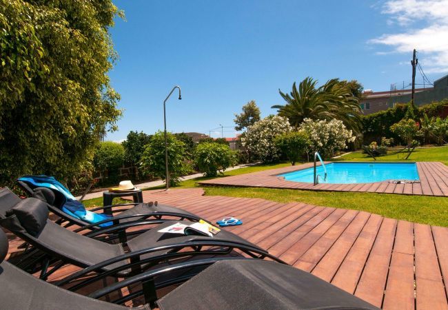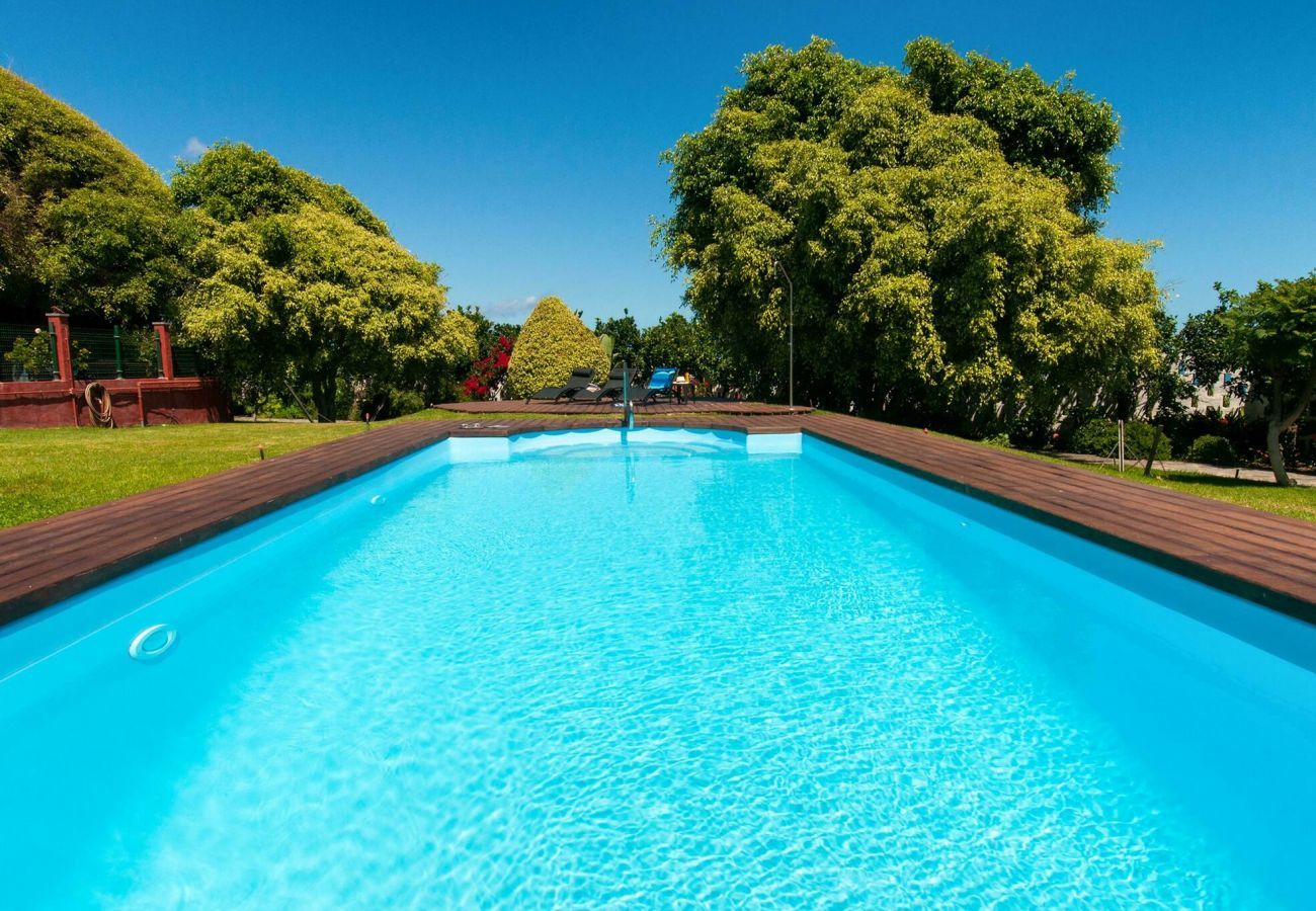 Finca Arucas with a heated private pool is wonderfully hidden between the fruit trees in the rural north of Gran Canaria. Finca Arucas is a place that guarantees an unforgettable holiday with the whole family or several families. Once through the gate of the driveway, tranquillity radiates from your surroundings. In the spacious garden is a lawn with a heated private swimming pool in the middle. The large outdoor barbecue can be used to prepare easy meals. Play a game of tennis on your own tennis court next to the Finca, discover the banana bunches in the adjacent banana plantation or just relax at the pool.