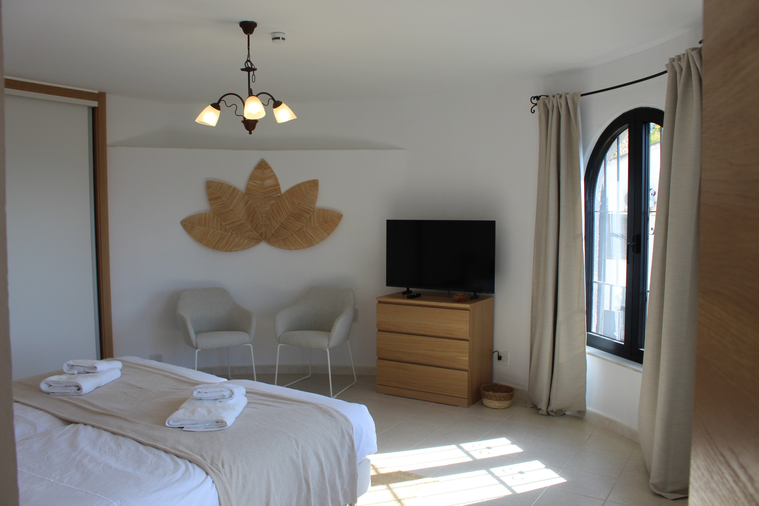 From the living room, you reach the lovely swimming pool (7 x 4 m) with four sun loungers, an outdoor shower, parasols, and two seating areas. The pool offers plenty of privacy and stunning views of the surrounding area and the sea.