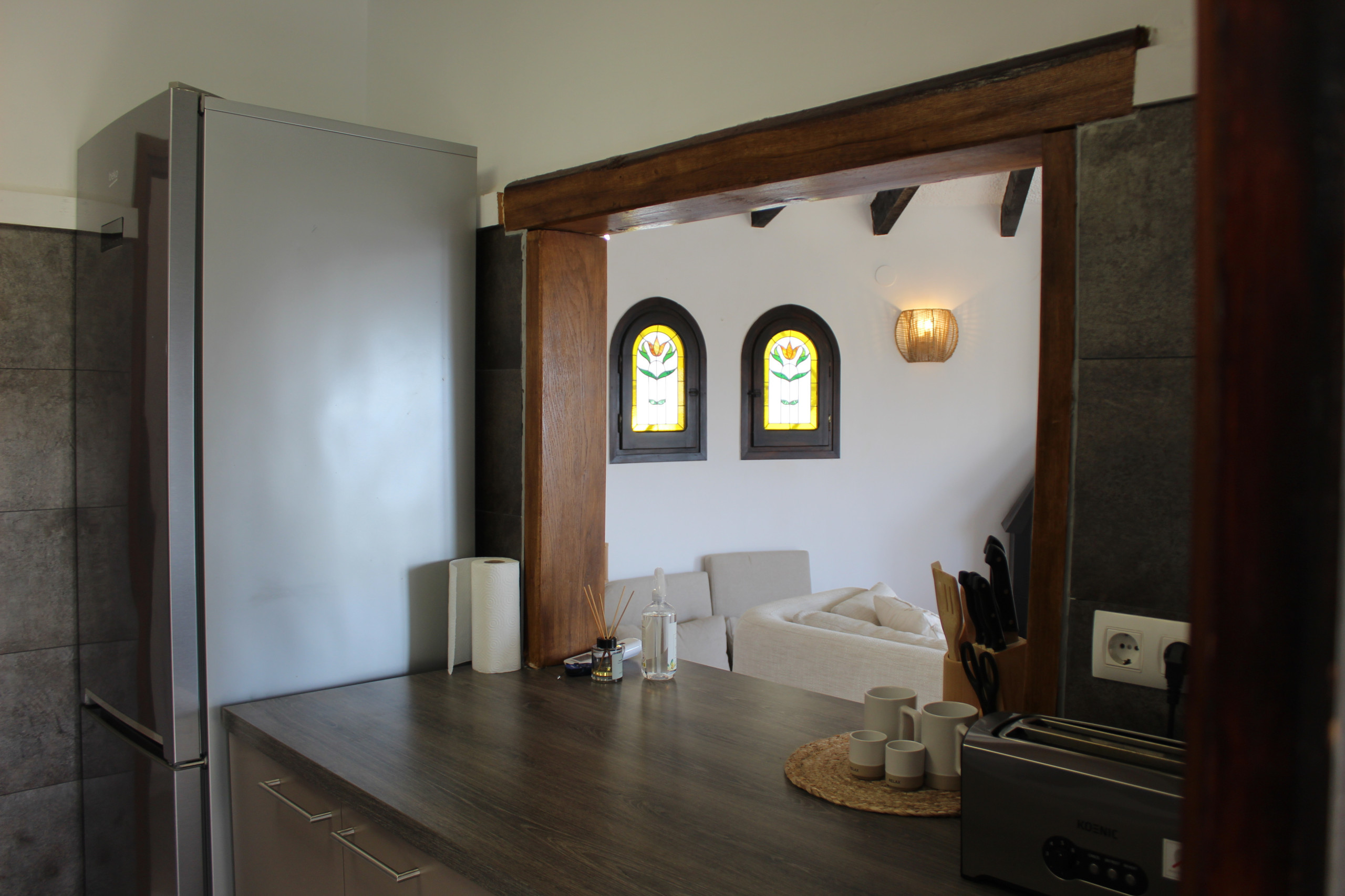 The second spacious living floor is located above the first floor and is accessible via a staircase on the outside of the house. You enter into the dining room with a circular dining area. Adjacent is a cozy living room with a fireplace and a fully equipped open-plan kitchen with a refrigerator/freezer, dishwasher, microwave, oven, 3-burner gas stovetop, hand blender, toaster, kettle, and Nespresso coffee maker. Bedroom 2: two single beds (90x200 cm). Bedroom 3: one double bed (150 x 200 cm). All rooms have air conditioning and mosquito screens. The second bathroom has a shower, toilet, and hairdryer.