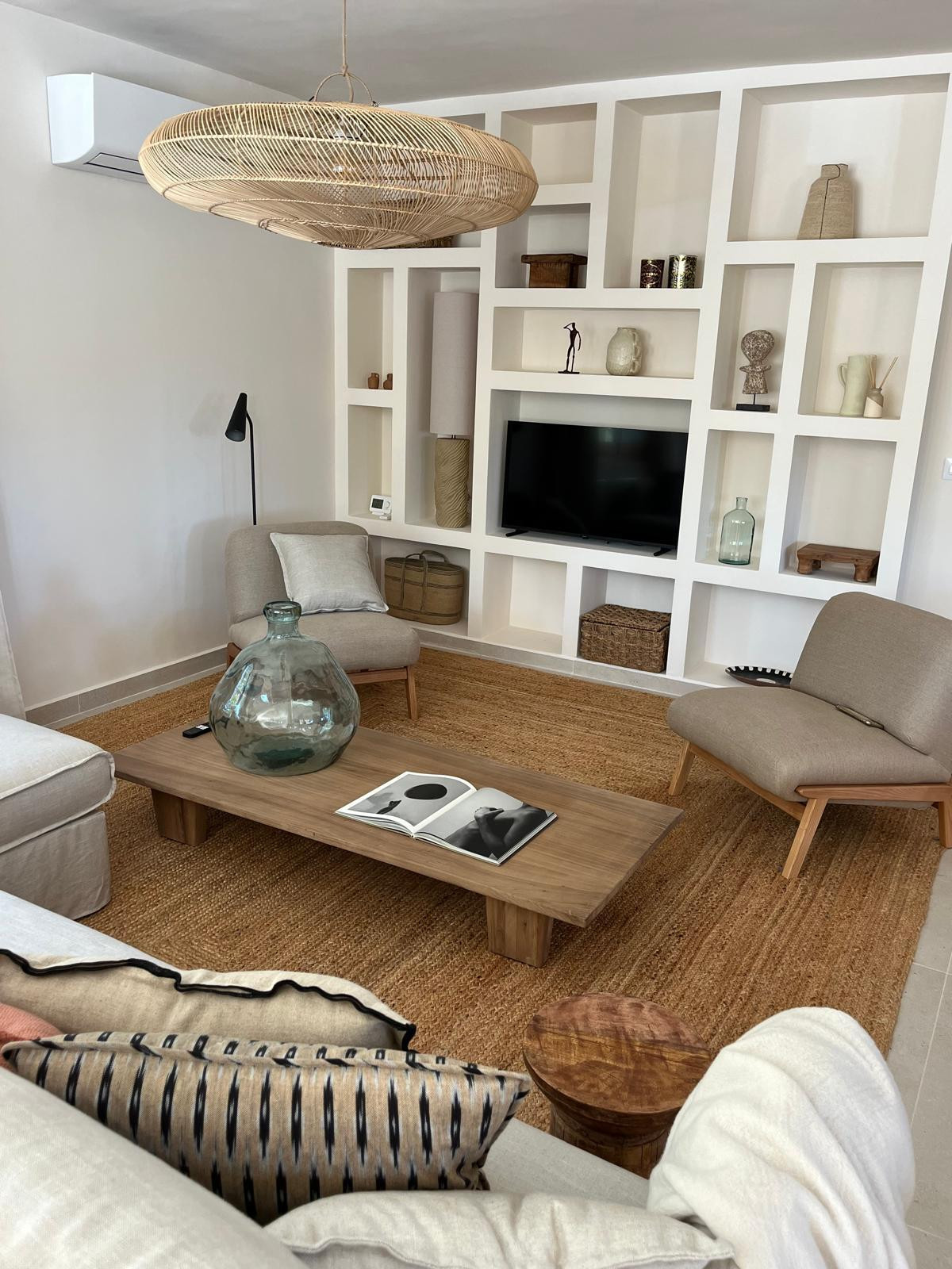 Inside, you will find a bright, open-plan living area with wooden accents that perfectly complement the Spanish charm. There is a living room with a comfortable seating area and a cosy dining area, ideal for relaxing together.