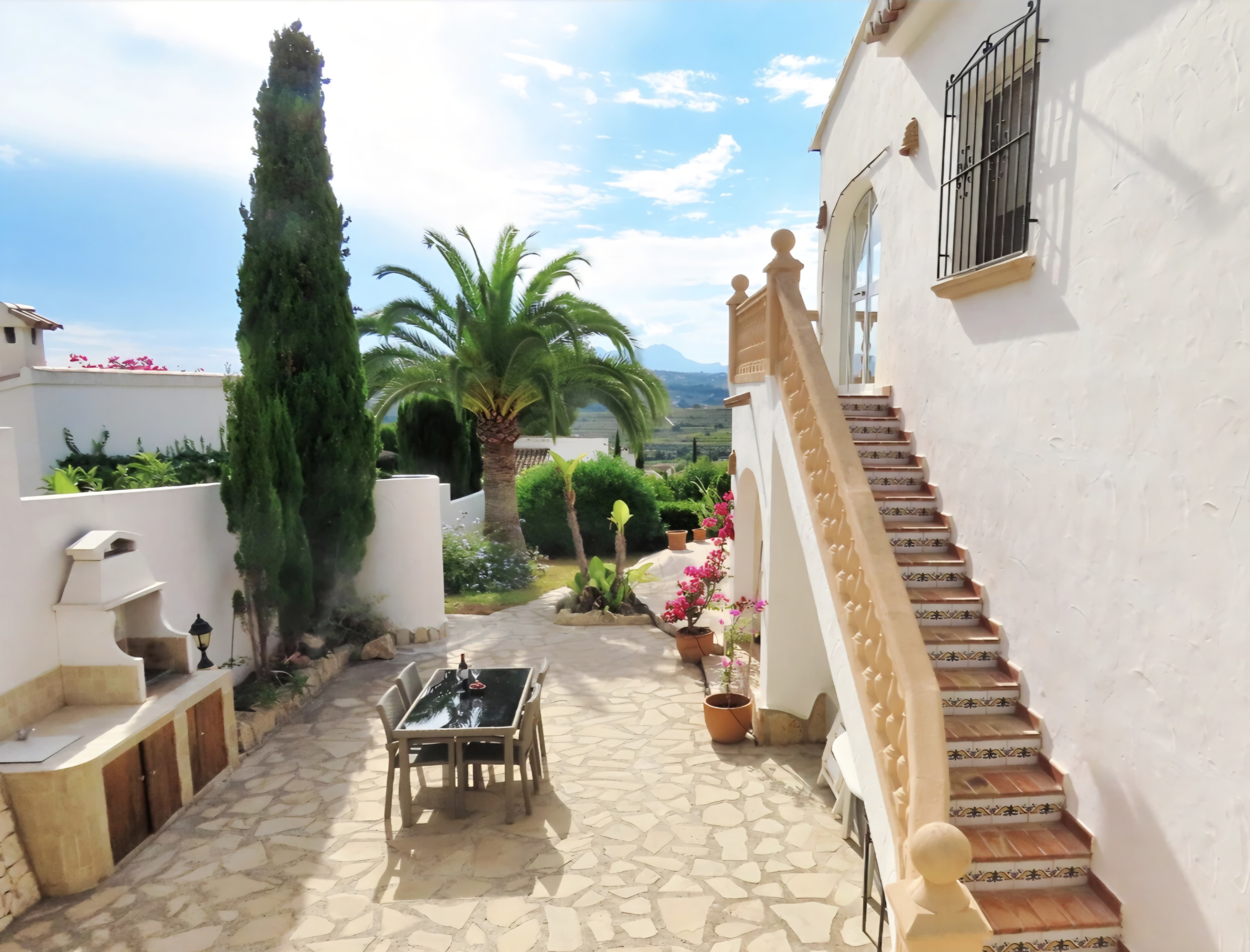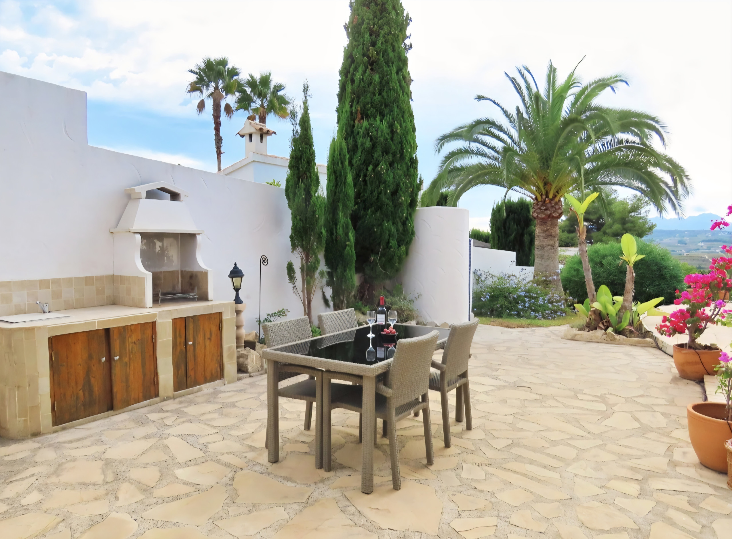The view from Villa Benitachel is magnificent and very relaxing over the rolling valley with beautiful rugged mountains in the background and partial sea views. The site is completely walled and closed by an entrance gate. The pool is surrounded by lovely sun beds and a barbecue is provided for full enjoyment of the Spanish outside living. The garden is a wonderful place to spend the days relaxing. There is a nice outdoor shower in the garden and, like the outdoor kitchen, it has hot and cold water. There is a covered terrace overlooking the surroundings and the garden. Opposite the outdoor kitchen there is a storage room with a toilet and sink. Here is also the washing machine and an extra freezer.