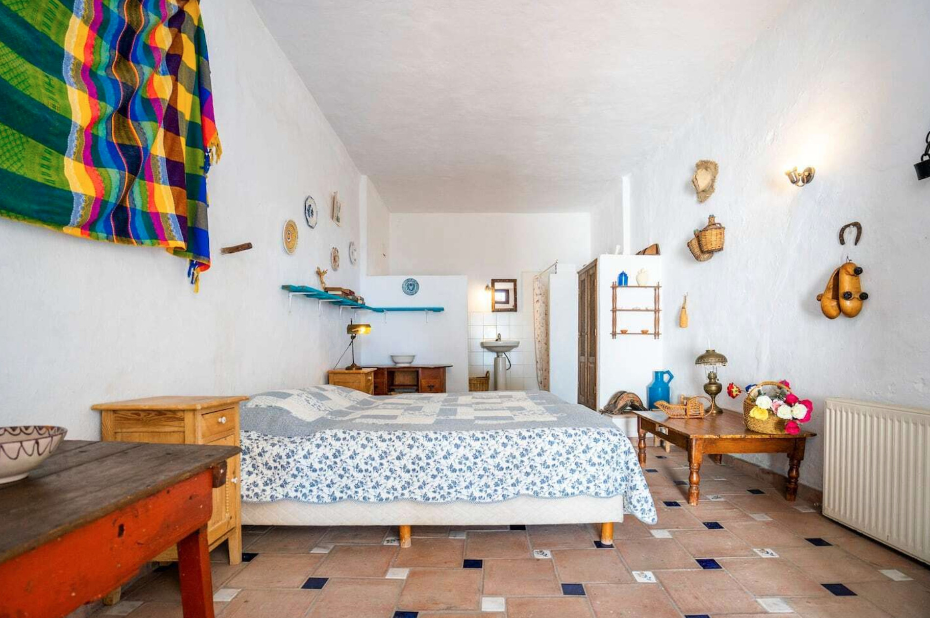 Next to the kitchen on the left is a spacious - wheelchair-friendly - bedroom with air conditioning for two persons with a door to the terrace. There is also an adapted bathroom with shower here. On the right side the cozy living room has a separate bathroom with bath and shower. If you walk a little further, you will arrive in two large bedrooms, of which one is suitable for three people. The bedroom has glass patio doors to a terrace. However, one of the bedrooms is very spacious that sufficient privacy has been created behind a beautiful folding screen for two more single beds. The fourth bedroom is located beneath the villa and can be reached via a small staircase. This bedroom is in the old one bodega and has been completely transformed into a comfortable place to sleep. Here you will find a large double bed, bedroom with shower & toilet and a small sitting area. There is a small terrace with a seat for this room as wel.