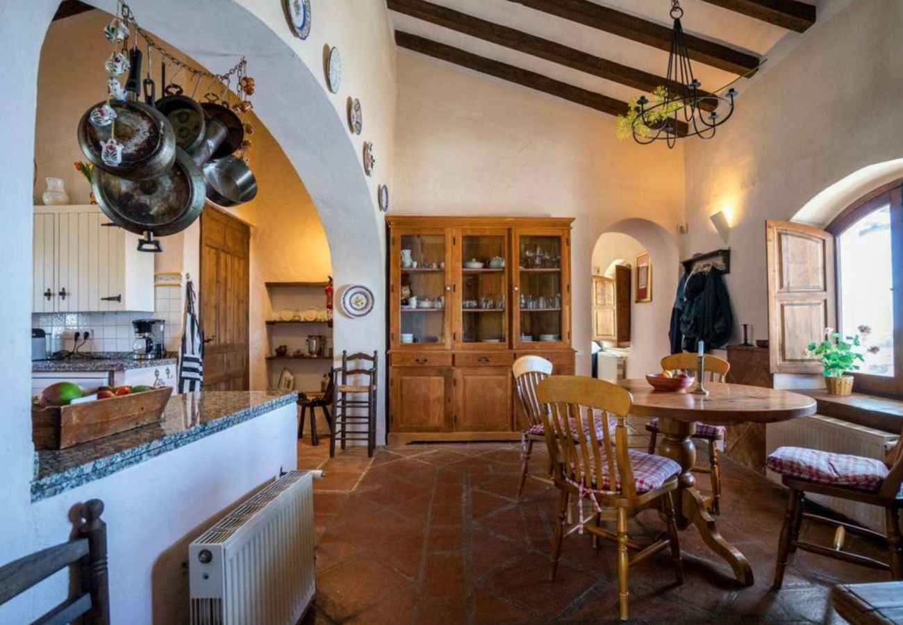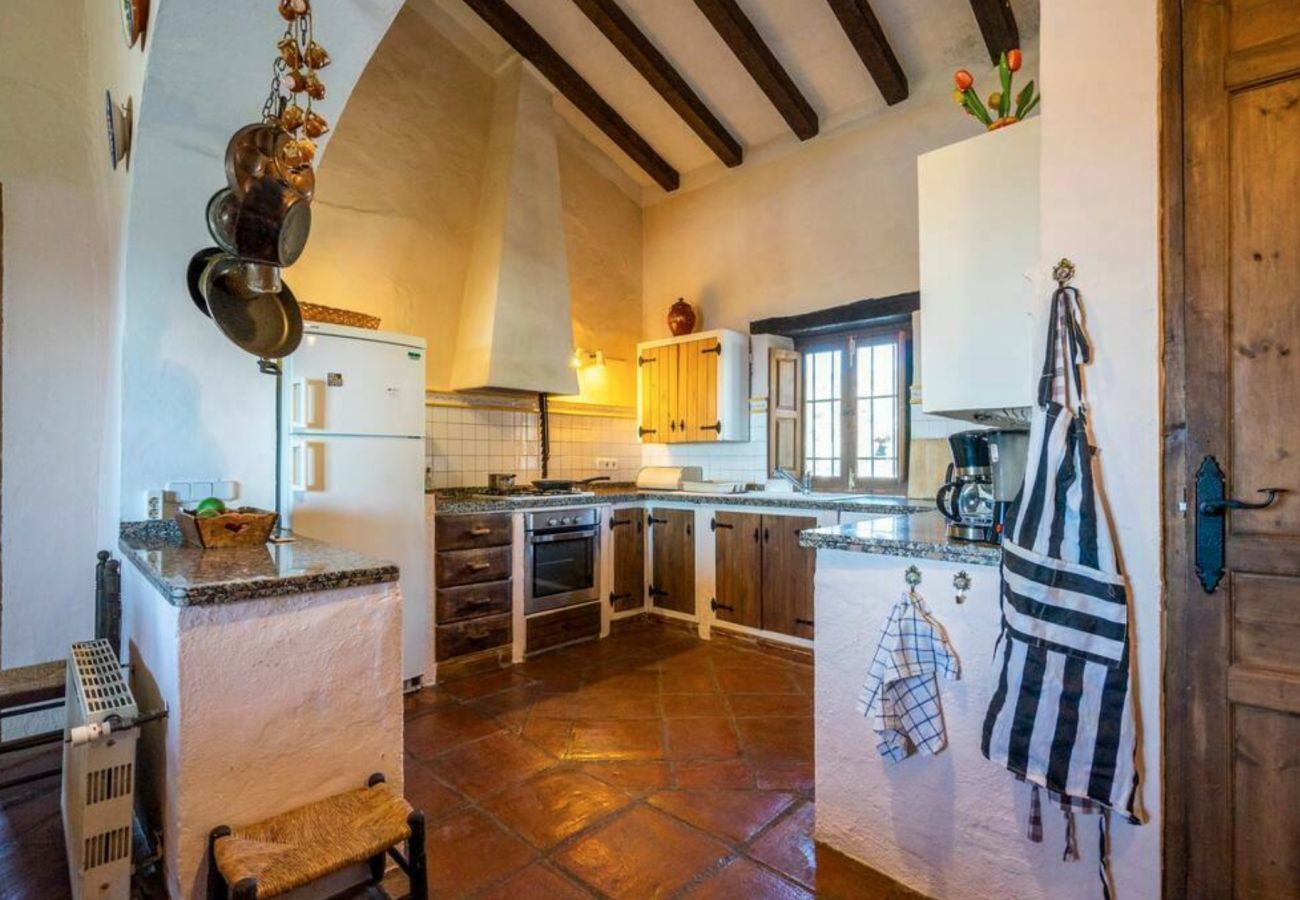 From the main entrance of this villa with large private pool in Andalusia you step into the spacious living room which is attractively decorated with a comfortable sofa and chairs next to one of the two open fireplaces. There are patio doors to the terrace, there is one stereo / CD player, satellite television and DVD player. Separated through a spacious arch, you will encounter the spacious dining room with antique dining area against the salon. The table can accommodate 8 people. The spacious dining kitchen has a large wooden dining area, plenty of space and all the necessary facilities such as a refrigerator with freezer, oven, hobs, dishwasher, microwave, kettle, juicer and washing machine. In addition, all kitchenware are provided. There is also central heating throughout the house available. Air conditioning is available as well.