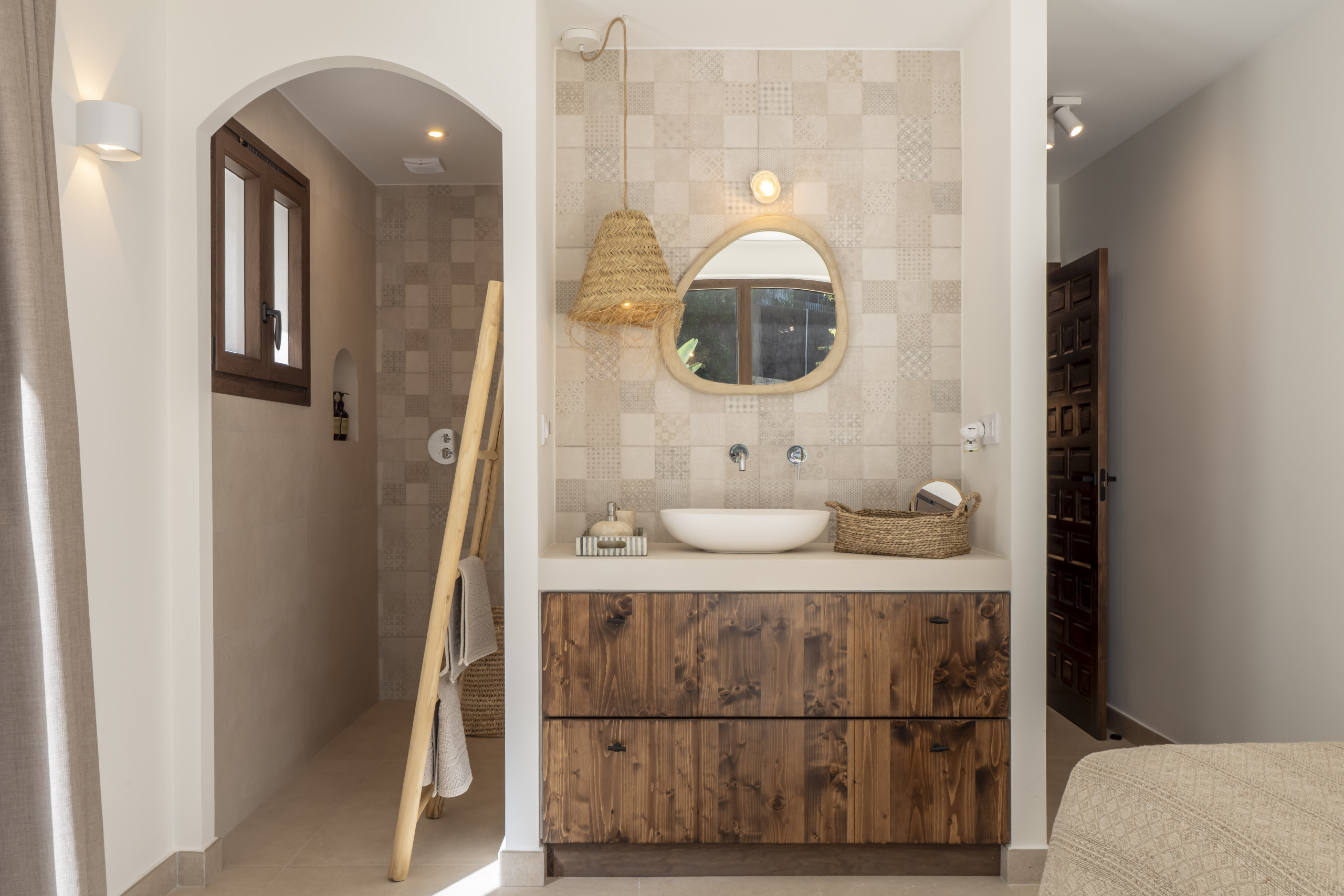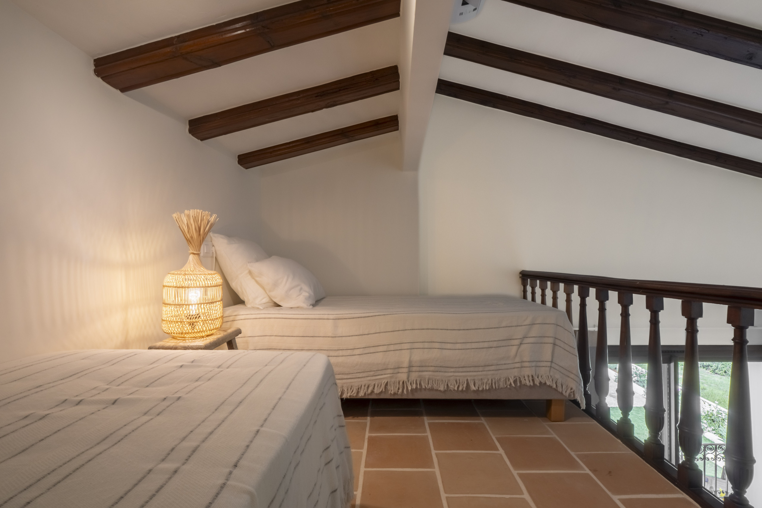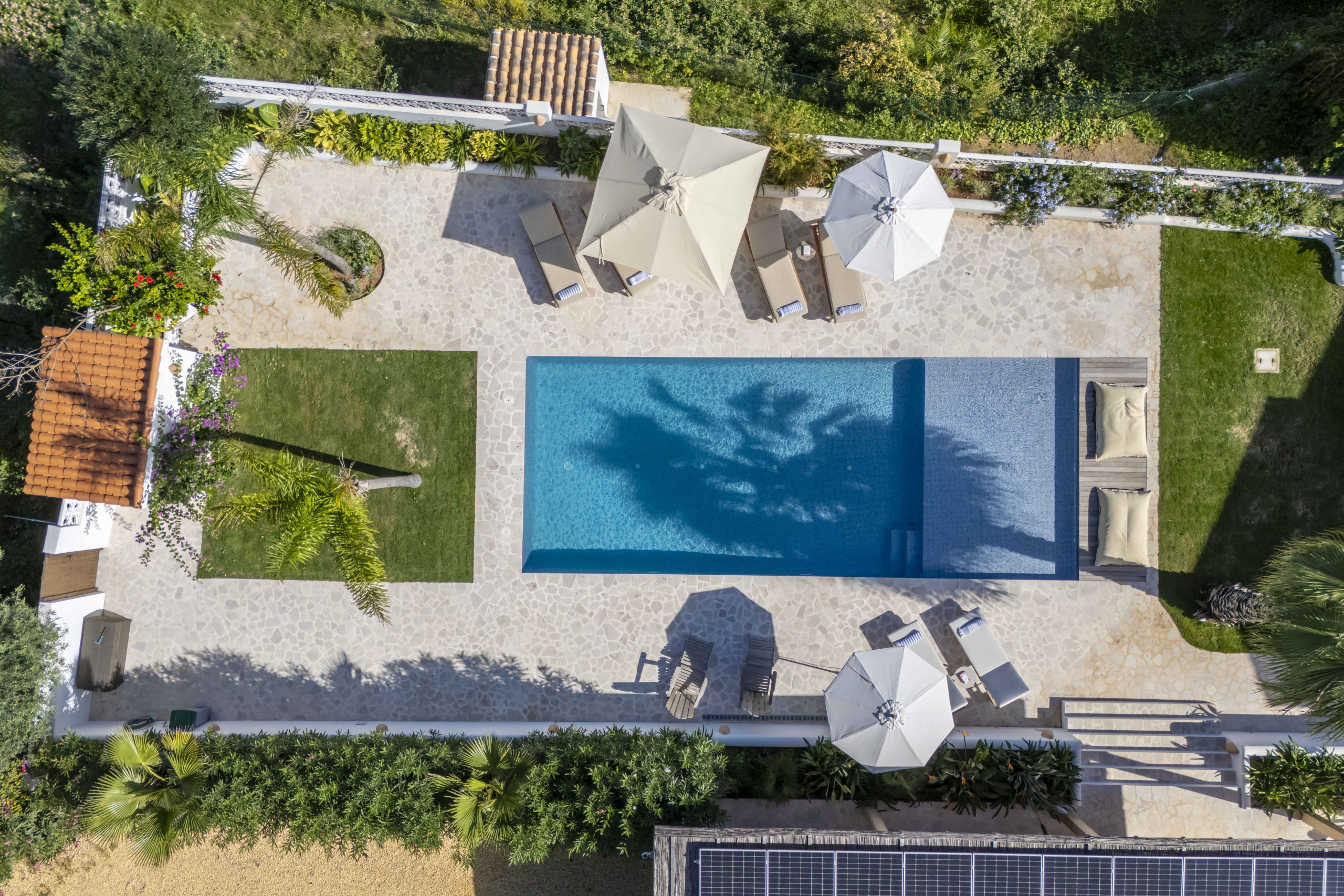 What a lovely outdoor life! The garden of Finca Genciana is spacious, green and beautifully landscaped with a wide view of the surroundings and the sea in the distance. Centrally located is the private swimming pool (5 x 11 m, up to 2 m deep), surrounded by six sun loungers and an outdoor shower. In the garden house you'll find a complete outdoor kitchen with bar, refrigerator, barbecue and a dining table for 10 people. A nice place to enjoy the view and the silence until late in the evening. Parking is available on the property, with space for six cars.