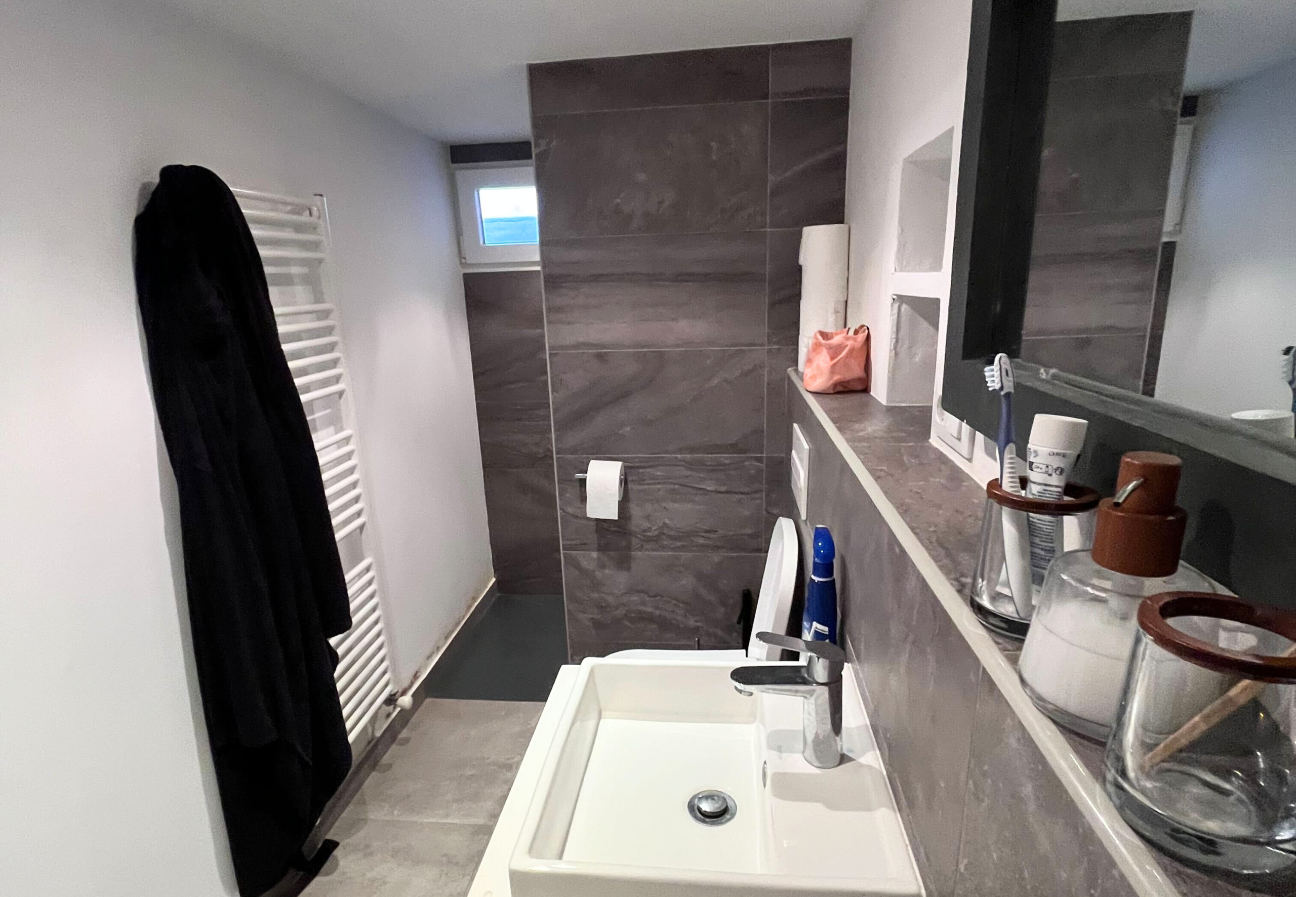 The garden is an oasis of greenery and offers privacy. Under the canopy is a spacious outdoor kitchen with a gas barbecue next to it, ideal for cooking and dining together at the long dining table. Sun loungers are invitingly arranged around the private swimming pool, and the outdoor shower provides refreshment after a day in the sun. For those arriving by car, there is ample parking space on the property (suitable for about 3 to 4 cars).