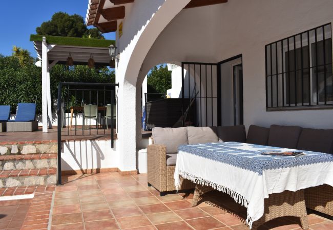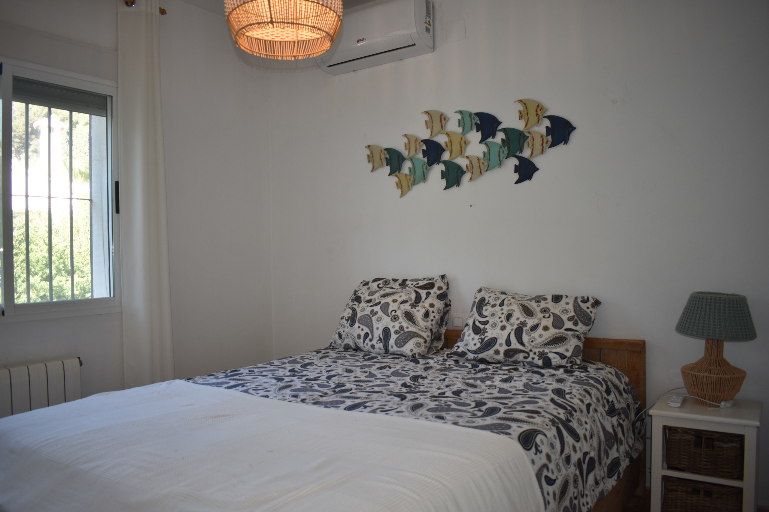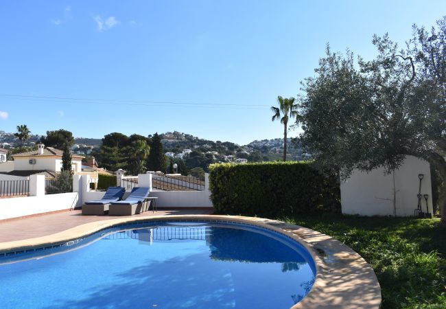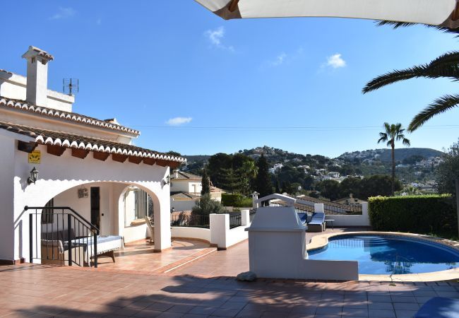 A charming villa with a private swimming pool, spacious terrace with comfortable sunbeds. Within walking distance (about 15 min) you will find the centre of Moraira with restaurants, shops and the Platja l'Ampolla beach. Villa Encanto is a detached, single-storey villa with a spacious private swimming pool (kidney-shaped approx. 8 x 2.50m), veranda with lounge sofa, and there is also a charcoal barbecue available. The villa is located in a quiet neighbourhood close to all amenities. In the fishing village of Moraira, you will find small-scale bays, cosy squares, many restaurants and walking opportunities such as the Paseo Ecológico route.