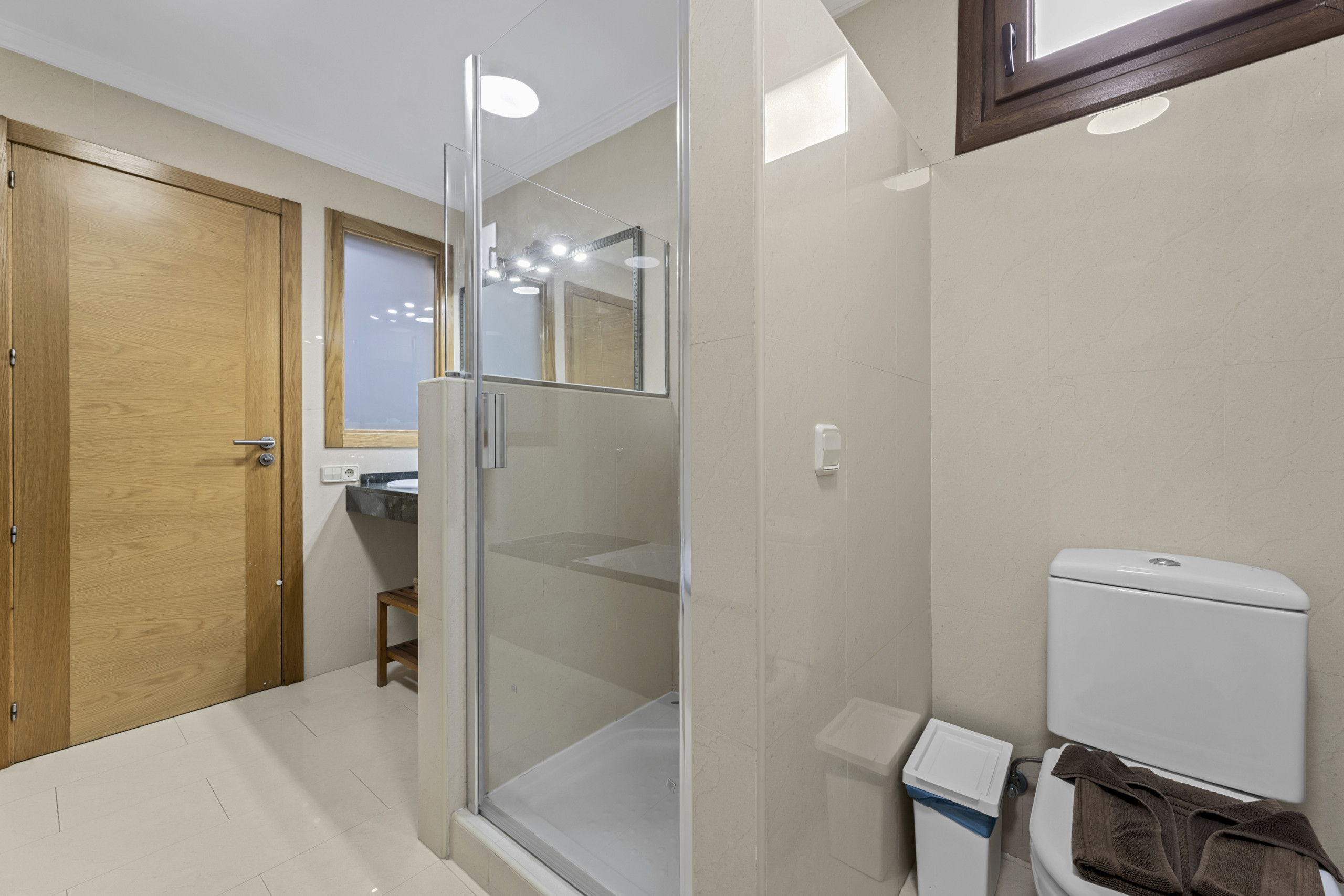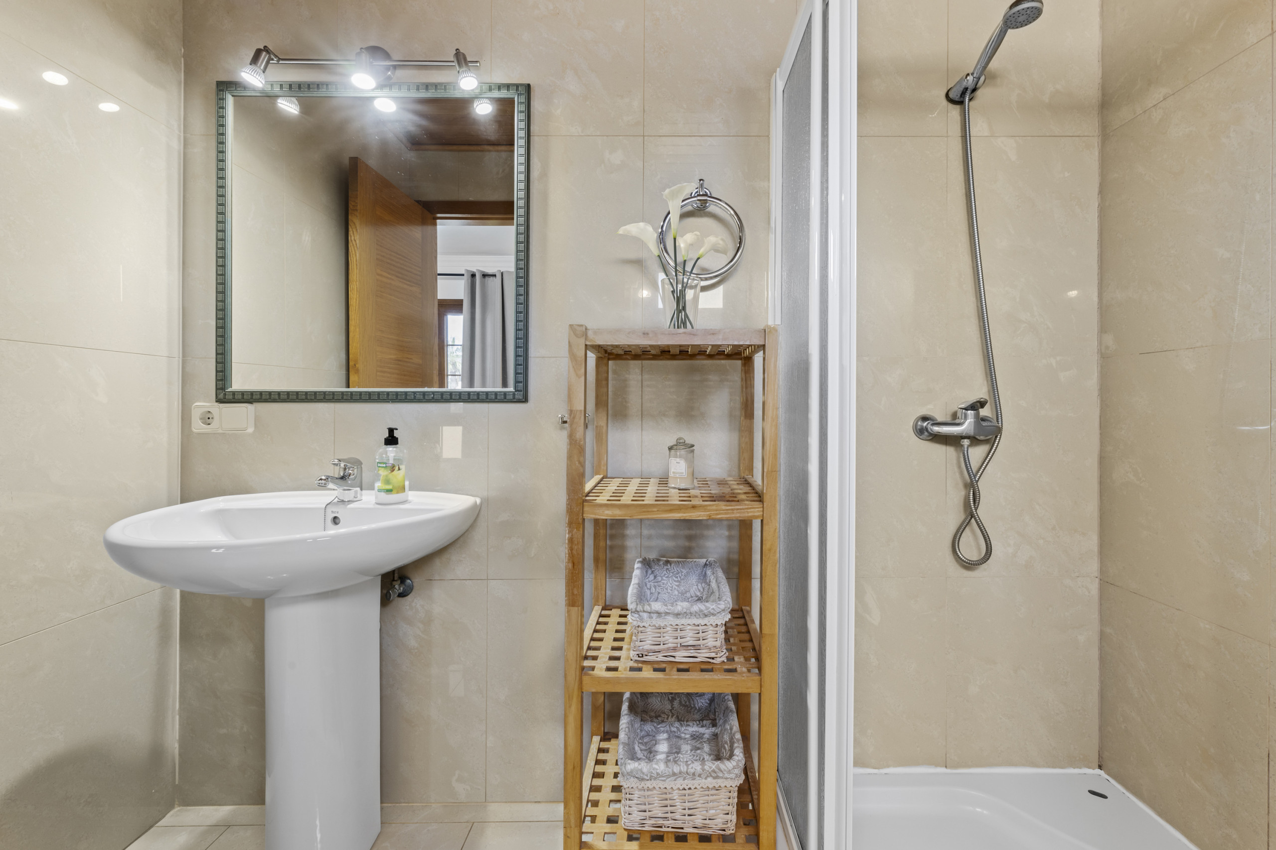 The villa consists of two floors. You enter on the ground floor with a spacious hall and separate toilet with sink. The living room with dining area is bright and spacious, including a smart TV with streaming services. The kitchen is fully equipped with dishwasher, oven, microwave, fridge, freezer, coffee maker, kettle and plenty of utensils. On the ground floor are two bedrooms, both with double beds and two bathrooms. One bathroom has a toilet, bidet, double sink and a shower in a bathtub. The second bathroom has a shower, toilet and sink.