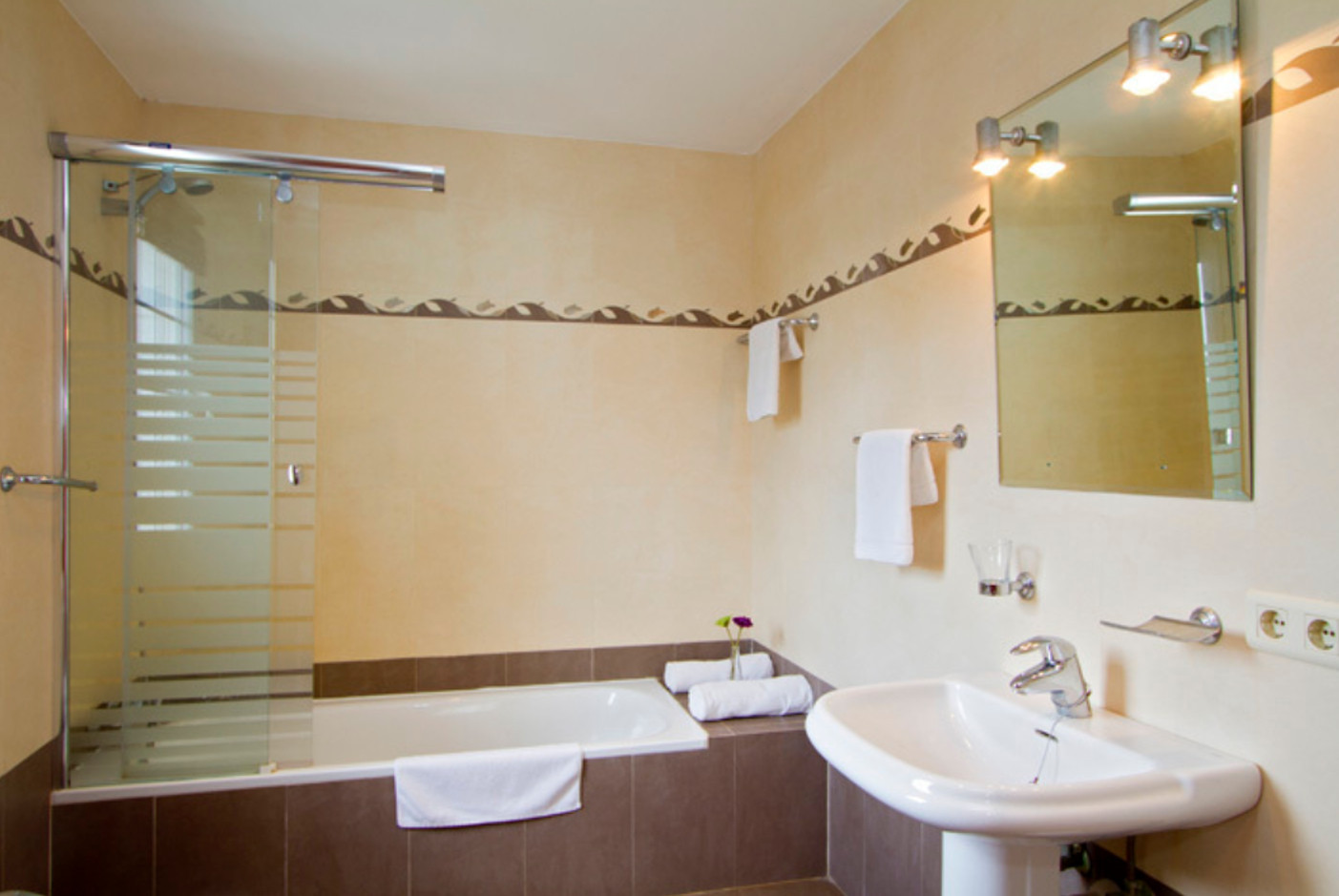 The bedrooms are located on your left hand upon entering. Bedroom 1 has a king-size bed and an en-suite bathroom. Bedrooms 2 and 3 both have two single beds. Bedrooms 4 and 5 are located in the basement and have a king-size bed and two single beds. The living room and all bedrooms are equipped with air conditioning. The en-suite bathroom of bedroom 1 and the bathroom on the ground floor have a toilet, bidet, washbasin and a bath-shower combination. The third bathroom is equipped with a toilet, washbasin and walk-in shower. In the basement, there is a spacious, open games room with a table tennis and pool table.