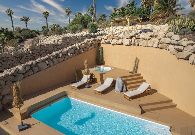 The outdoor area of Villa Estella Golf is a true paradise. In the spacious and beautifully landscaped garden, you will find everything you need for relaxation and enjoyment. The heated private pool (8m×4m) features built-in massage beds and ambient lighting, perfect for enjoying both day and night. Surrounding the pool are comfortable sun loungers and umbrellas, so you can soak up the Canary sunshine. Additionally, there is a jacuzzi for 4-6 people, placed discreetly for extra privacy, where you can unwind after a day full of activities. The elevated part of the garden features a barbecue area with a spacious 40 m² terrace, ideal for enjoying outdoor dining while overlooking the surrounding nature and golf course. The terrace is fully furnished with outdoor furniture, including a large dining table and chairs. The villa also offers four electric bikes (available for rent) – perfect for exploring the surrounding area.