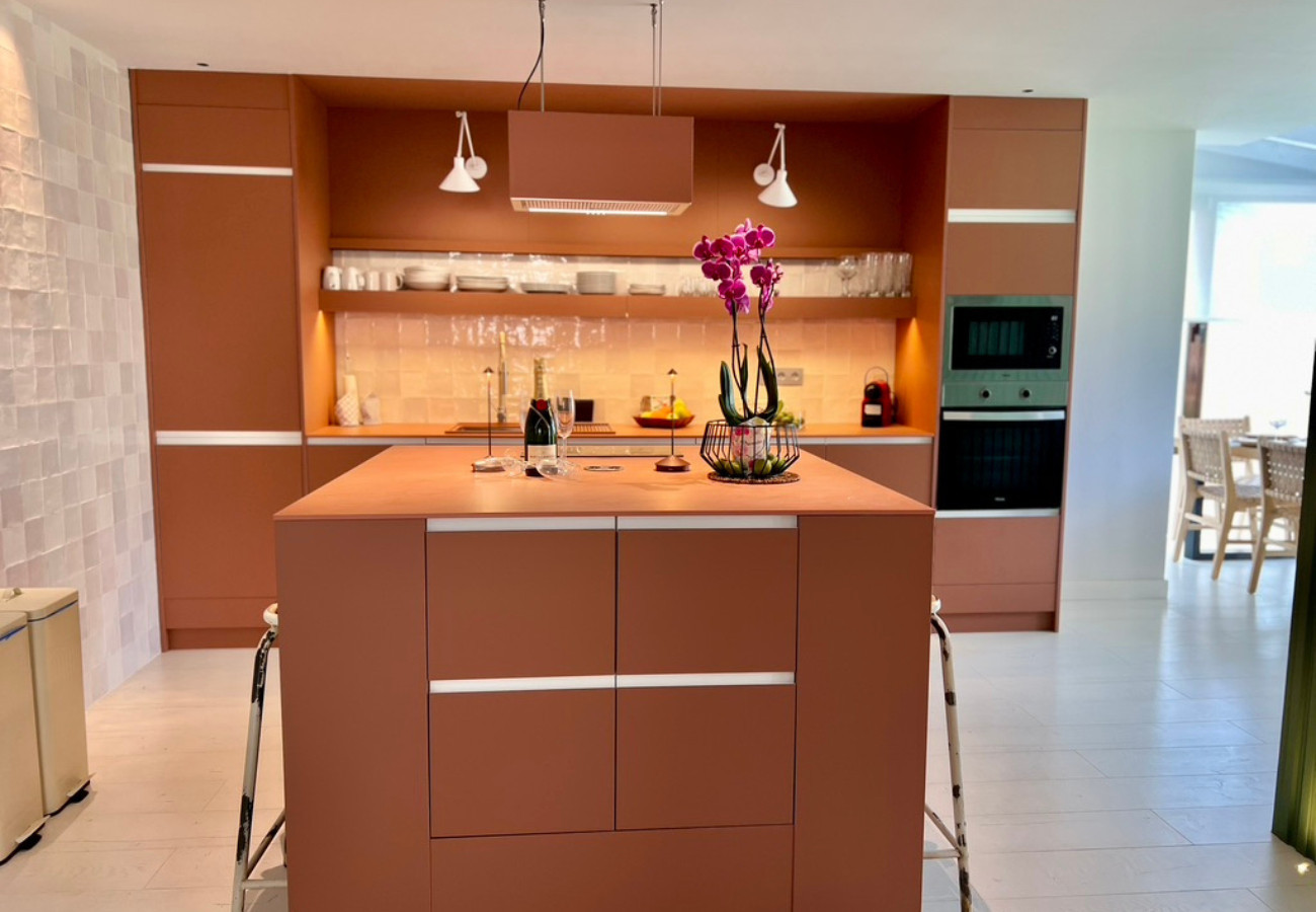 The ground floor welcomes you with an open and bright living area that provides direct access to the garden and pool. This space features a comfortable seating area with a large sofa, a Smart TV with international channels, and fast Wi-Fi available throughout the house. The large sliding glass doors allow a seamless connection with the outdoors, so you can always enjoy the stunning views. The modern kitchen is fully equipped with top-notch appliances, including an induction hob, fridge with freezer, oven, microwave, dishwasher, washing machine, espresso machine, kettle, toaster, juicer, and all necessary cookware and tableware. The adjacent dining area comfortably seats six people, perfect for shared meals.